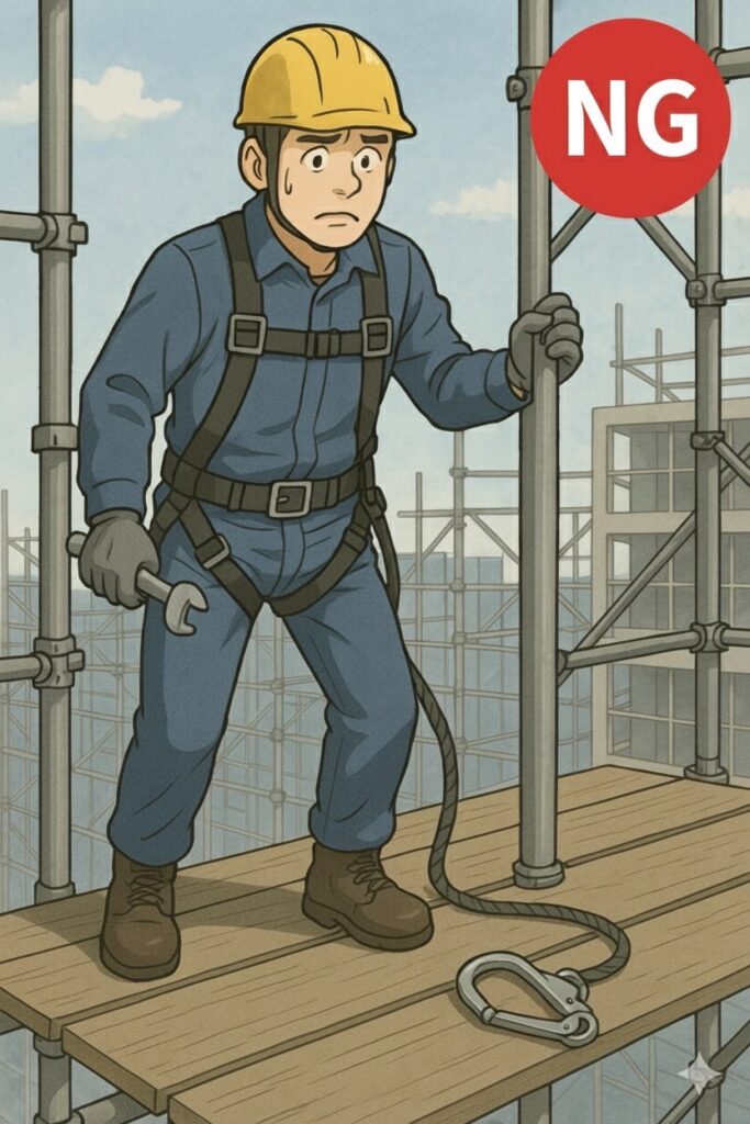 左図:「墜落制止用器具の安全な使用に関するガイドライン」に基づき、フルハーネスの不適切使用は禁止されています。https://www.mhlw.go.jp/stf/houdou/0000212834.html