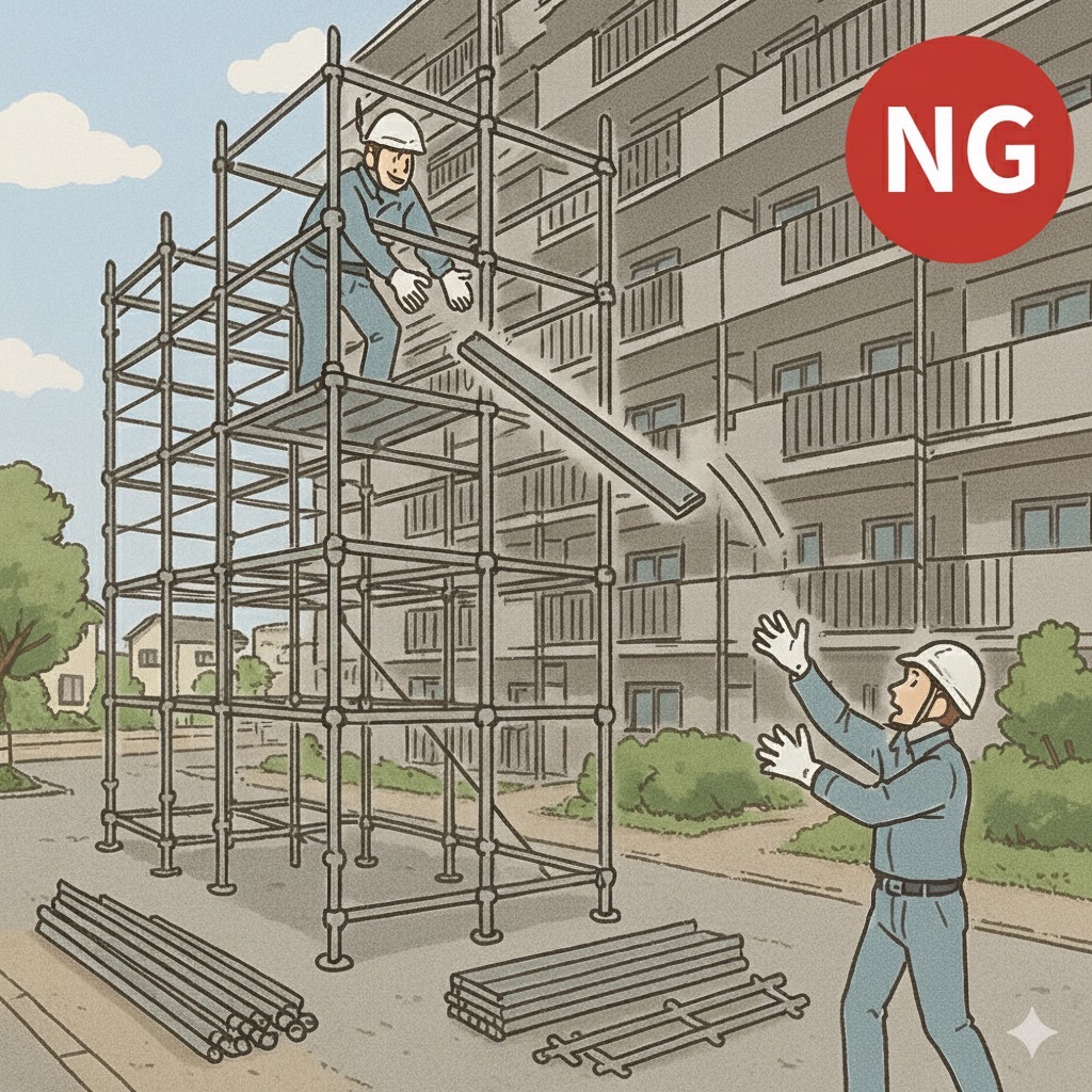 右図:部材は「手渡し」や「つり縄・吊り袋」等で運搬することが求められています。