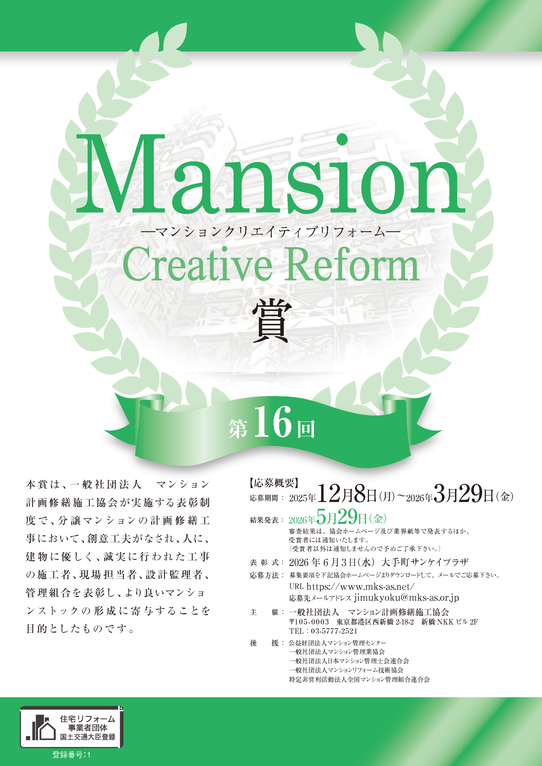 マンションクリエイティブリフォーム賞とは、一般社団法人マンション計画修繕施工協会が実施する表彰制度で、分譲マンションの計画修繕工事において、創意工夫がなされ、人に、建物に優しく、誠実に行われた工事の施工者、現場担当者、設計監理者、管理組合を表彰し、より良いマンションスストックの形成に寄与することを目的としたものです。