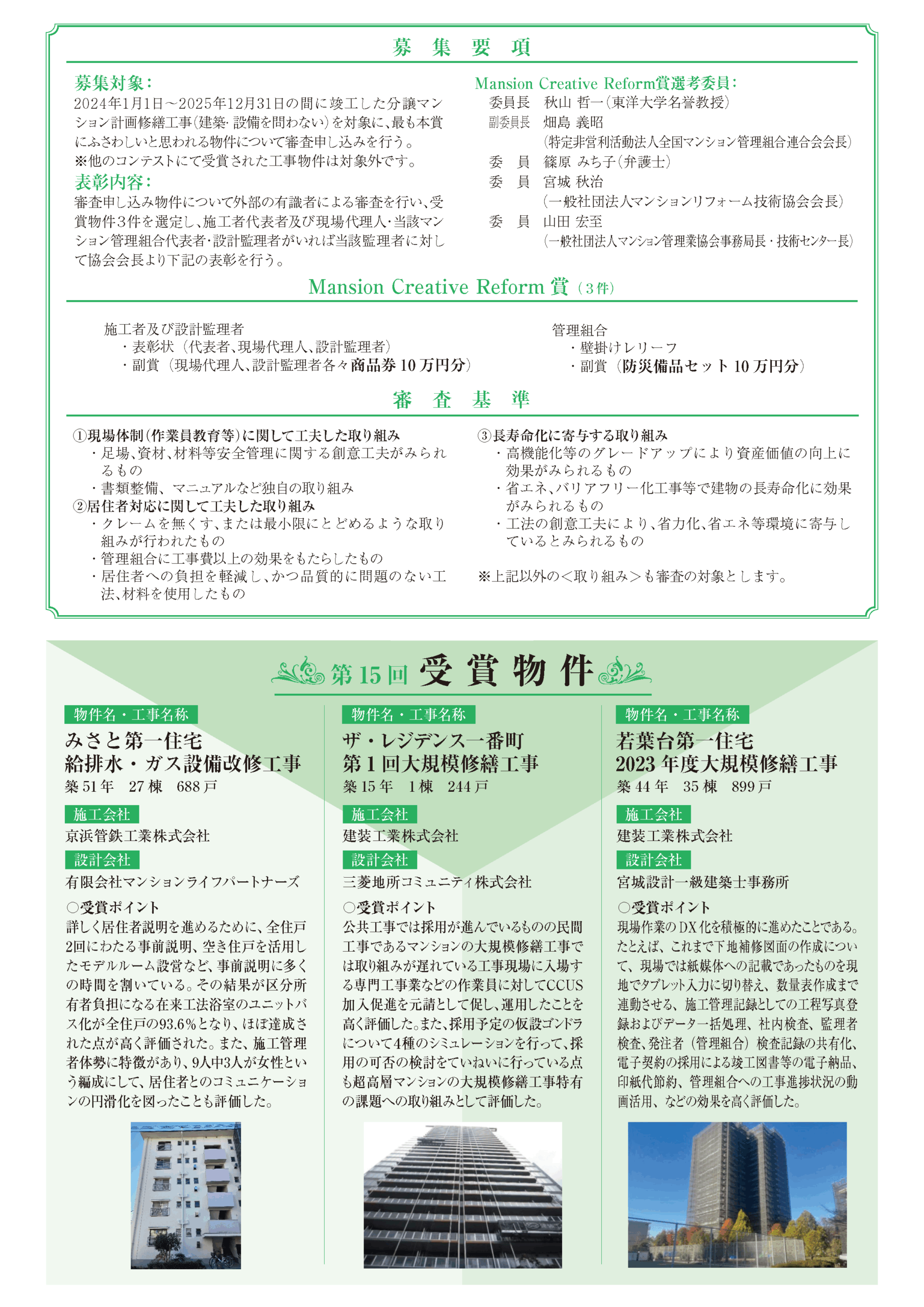 2024年1月1日~2025年12月31日の間に竣工した分譲マンション計画修繕工事(建築・設備を問わない)を対象に、最も本賞にふさわしいと思われる物件を管理組合及び設計者から承認を得て、元請施工業者からご応募ください。なお、設計者からの推薦も可とします。